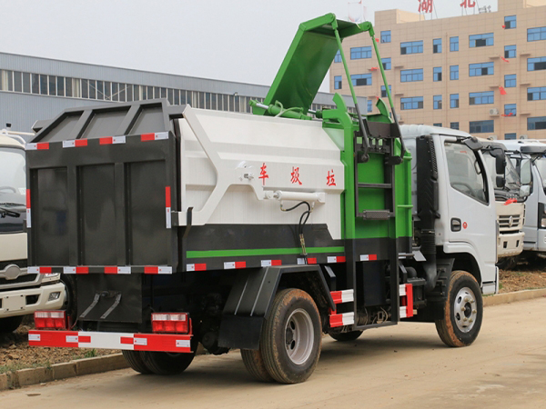 該車箱體有效容積:5立方,箱體前部側面帶有掛桶提升機構,可自動舉升垃圾桶倒入垃圾,帶自卸功能,尾部裝有橡膠密封條,防污水滴漏,杜絕二次污染。掛桶垃圾車可根據客戶要求搭配120升或240升塑料桶和鐵桶。