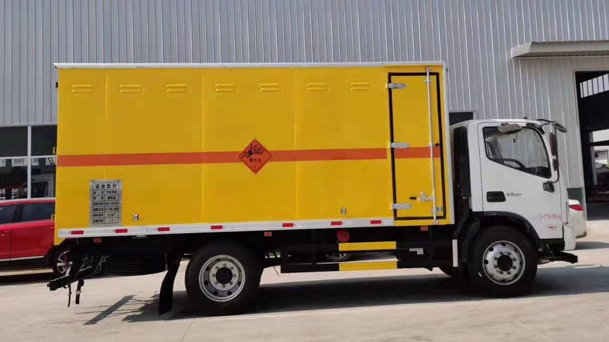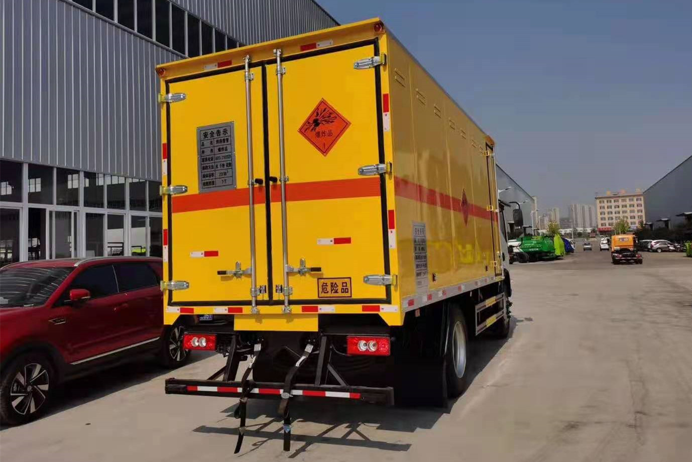 該車適用于運輸危險品,隨底盤選裝駕駛室,選裝右側不開門;危險貨物運輸車輛的類型(EX/Ⅲ),廂體頂部封閉,不可開啟,運送爆炸品的品名:黑火藥,壓縮黑火藥,電(非電)引爆雷管,爆破炸藥,導爆索,點燃導火索;運送爆炸品的項號:1.1D,1.1D,1.1B,1.1D;安全裝置為導靜電帶,用于防止靜電;僅采用底盤子午線輪胎和帶ABS的底盤,該車前輪安裝盤式制動器,前置排氣管,裝配限速裝置,限速80km/h;安裝帶有衛星定位功能的行駛記錄儀;側防護和后防護裝置材料材質為Q23**碳鋼,側防護與箱體底板和副梁焊接連接,后防護裝置與車架采用焊接連接。后防護截面尺寸(mm):120×50,離地高度為500mm。整車長度/軸距/后懸對應關系為(mm):7030/3800/2**。僅采用發動機F3.8NS6B156對應的油耗值(L/**km)為:20.81。ABS系統**器型號/生產企業:ABS-E/威伯科汽車**系統(**)有限公司,ABS-VI·E/廣州瑞立科密汽車電子股份有限公司。轉向輪裝備輪胎爆胎應急防護裝置。隨底盤選裝駕駛室。 |
